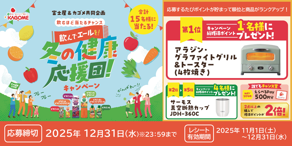 - 2025年11月01日【12/31(水)まで】富士屋&カゴメ共同企画「飲んでエールを!冬の健康応援団!キャンペーン」のご案内