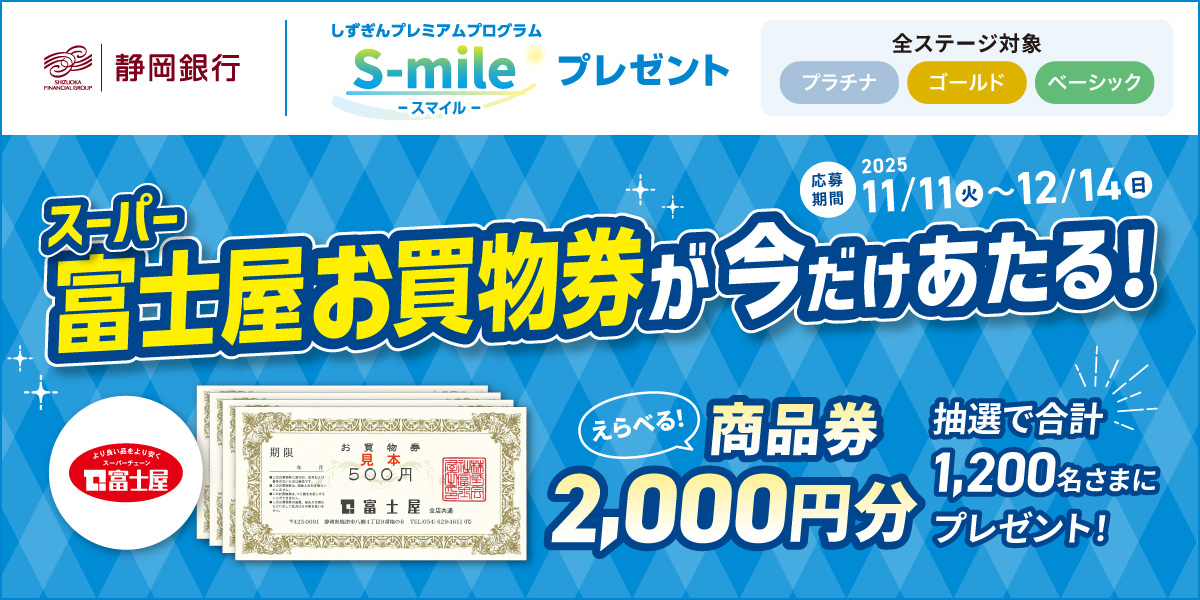 - 2025年11月11日【12/14(日)まで】スーパー商品券2,000円分を抽選でプレゼント!静岡銀行「S‑mileプレゼントキャンペーン」のご案内