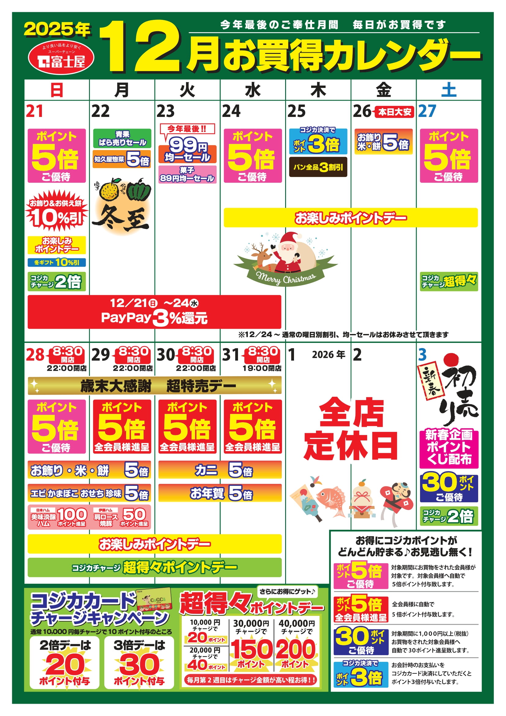 2025年12月25日ポイント企画が満載!12月後半~2026年年始のお買い得カレンダー