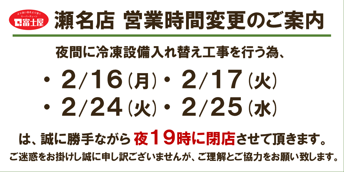 毎度、富士屋瀬名店をご利用くださいまして、誠にありがとうございます。 瀬名店は冷凍設備入れ替え工事の為、誠に勝手ながら以下の日程は 開店9時~19時閉店とさせて頂きます。