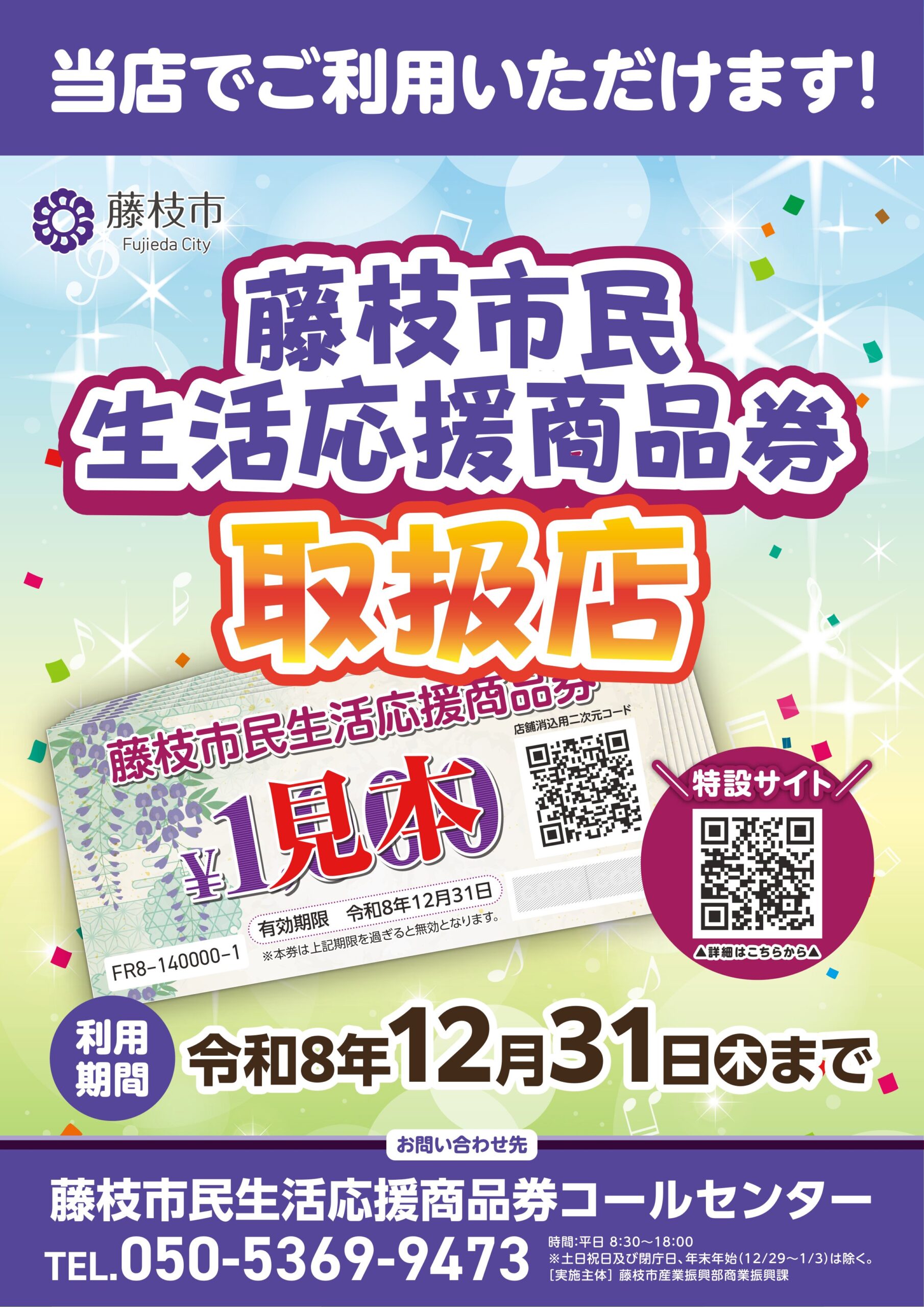 藤枝市の店舗で使えるお得な「藤枝市民生活応援商品券」 当店でもお使いいただけます。 お支払い時にレジ係にお申し付けくださいませ。