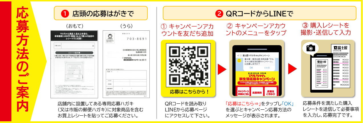 キャンペーン期間中にお買い上げ頂いた、マルちゃん商品2品以上を含む、本体価格1,000円(税抜)以上ご購入の富士屋のレシート(※複数合算可)を1口として、LINEまたはハガキでご応募ください。